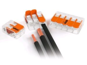 Lasklem: bekend en goed merk is Wago. Strip de te koppelen draden, klik de lasklem open, draden er in, klaar is de verbinding. Ook weer makkelijk los te halen. Let op de maat en je draaddikte: er zijn verschillende maten te koop.
